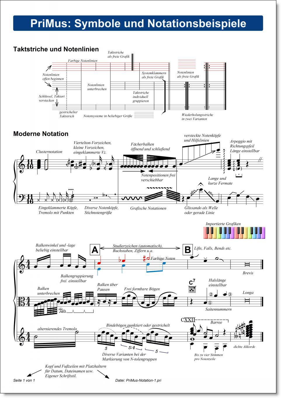 Die Notationsmöglichkeiten von PriMus sind beeindruckend vielfältig und flexibel. Einen Eindruck davon erhalten Sie, wenn Sie sich das nebenstehende Beispielblatt anschauen. Klicken Sie es an, um es in groß anzusehen oder laden Sie es als PDF-Datei herunter und drucken es bei sich in voller Qualität aus.
